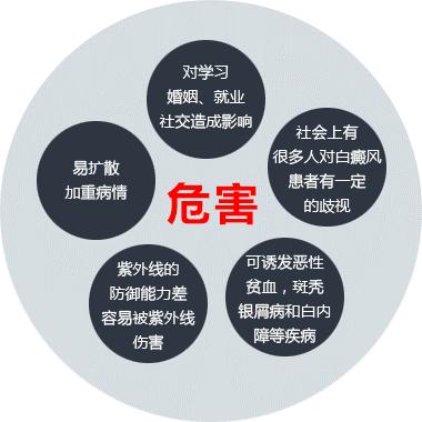现代社会还是有许多人对于白癜风这种疾病并不是很了解,因此也没有很重视该疾病,其实这样很危险。要是患者在患上白癜风以后,没有及时对白斑进行有效治疗,那么白斑就会给患者带来严重后果,影响到患者身心健康。那么白癜风给患者带什么危害?